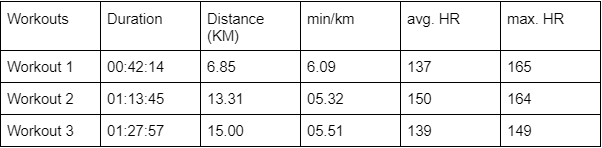 I did 3 sessions, 1 speed session, 1 easy run, and 1 long run—the overview you can find below.